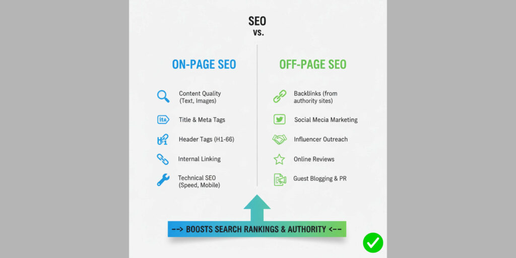 On-Page SEO involves optimizing elements within your website (such as content, meta tags, and structure). On the other hand, Off-Page SEO focuses on actions that take place away from your website, such as gaining backlinks, increasing social media mentions, and improving your online reputation.